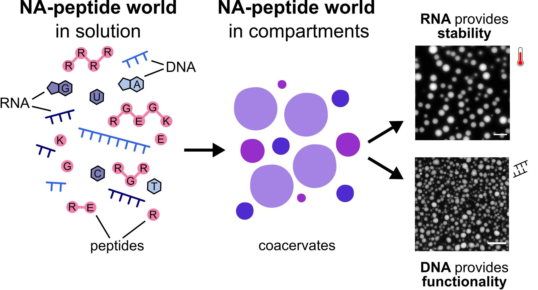Recent work by HFSP Research Grant Awardee Claudia Bonfio and her colleagues addressed this paradox by studying minimalistic coacervate compositions. Unlike previous studies that focused on single peptides capable of liquid–liquid phase separation, her team investigated compositions compatible with early Earth scenarios: likely a mixture of short peptides and short nucleic acids. The team screened over 500 combinations of peptides and nucleic acids, searching for those that formed droplets of reasonable stability. This extensive search showed that arginine-rich tripeptides and DNA octamers (much shorter than anticipated) are sufficient to obtain coacervates, and that mixtures with excess peptide form the most stable droplets towards salt and temperature stress.