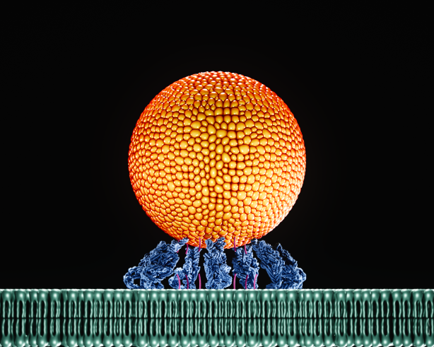 A cargo-loaded vesicle (orange) is tethered by seven exocyst protein complexes (purple) at 27 nm from the cell’s membrane (green). Animation produced by Dylan Godfrey for the Gallego lab with illustrative purposes.