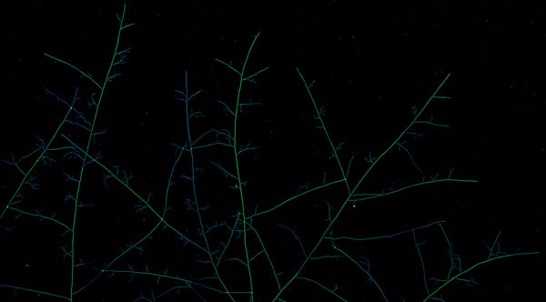 Figure: High-resolution image of AM fungal network. Image formed after stitching an array of 150 sub-images. The sub-images are taken using a high-resolution camera, together with a 2x long-working distance objective and the fungal network is illuminated with transmitted light. Finally, the image has color ascribed via Lookup table (LUT) using imageJ with Green Fire Blue color palette (Credit: Loreto Oyarte Galvez).