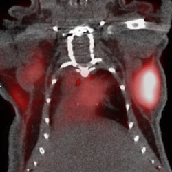 Figure: PET Image Quality Improvement Using Tissue-Dependent, Spatially-Variant Positron Range Correction. Images show a coronal slice of the PET/CT image of a mouse thorax with xenografted neuroendocrine tumors (NET). The CT image is depicted in black and white while the white and red is the resulting PET image for the 68Ga-DOTATOC radiotracer that binds to the somatostatin receptor expressed by the NET (contrast is enhanced for better visualization). (A) Non-PR corrected reconstruction produces a blurrier image with less defined contours plus a background haze that limits the accurate delineation of the tumor (hot area under the right foreleg); (B) PR-corrected image where the haze has disappeared and the tumor can be better delineated; (C) Horizontal profile across the mouse thorax depicting the PET image intensity showing how the PR-correction improves the uptake quantification on every tissue.