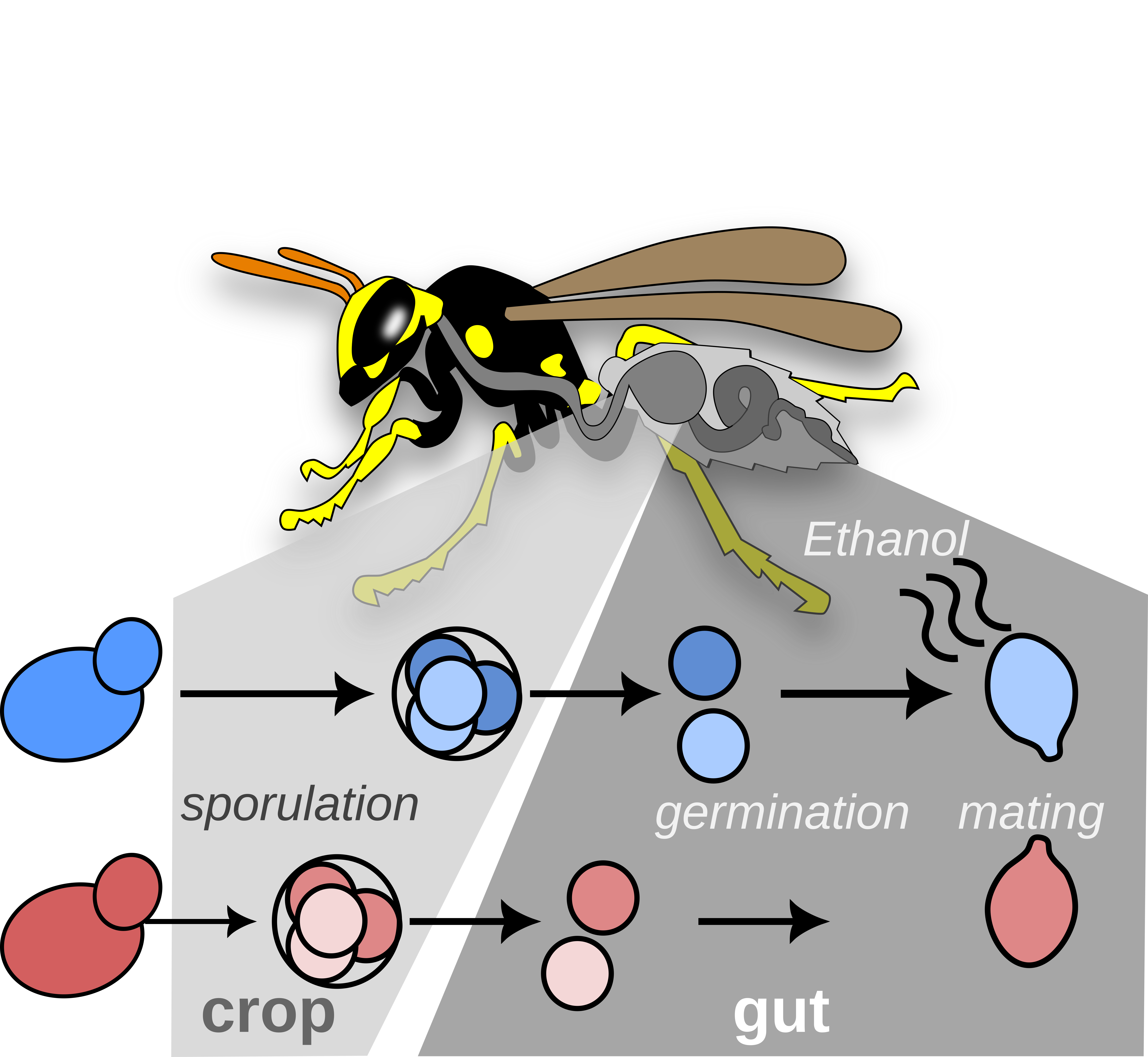 Together, these results provide two milestones for understanding yeast ecology and its associations: yeasts sporulate in the crop, then rapidly germinate and ferment in the gut. This sequence clarifies the steps leading to yeast mating. Importantly, it reveals why the partnership between S. cerevisiae and social wasps may be so strong—social wasps are unusually tolerant to ethanol, the compound yeasts produce inside them.